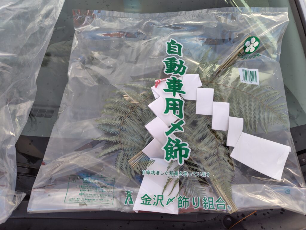 能登半島産のウラジロで作られた金沢しめ飾り組合の自動車用しめ飾り
