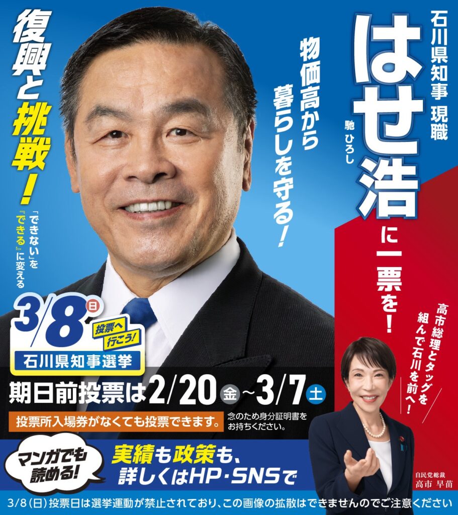 - 保守分裂の構図: 2026年3月の石川県知事選において、「先祖返り」を感じさせる山野候補と、高市総理とのパイプを強調し能登復興を掲げる馳候補の対比。