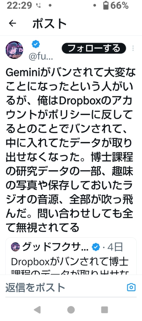 - Dropboxの事例(画像1枚目): この方はAIではなくストレージサービスの規約違反(意図せずポリシーに触れるデータが入っていた等)でバンされていますが、結果として「博士課程の研究データ」という人生を左右するデータを失っています。AI利用でもこれと同じことが起こり得るのが現在の状況です。