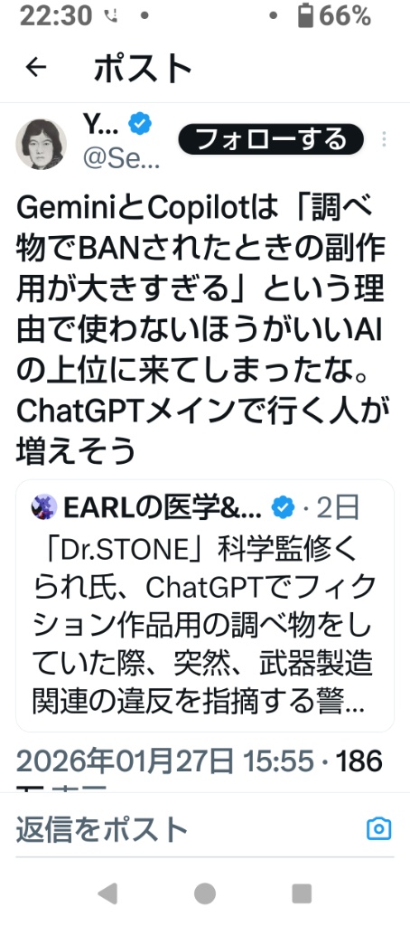 - 「くられ氏」の事例: 画像2枚目にある『Dr.STONE』の監修者・くられ氏のケースは、まさに2026年1月26日に起きたばかりの出来事です。創作のための「武器の調べ物」がAIの安全フィルターに「武器製造の助長」と誤認され、ChatGPTのアカウントがいきなり停止されました。異議申し立ても通らなかったと報告されており、プロの仕事道具が一瞬で奪われるリスクが浮き彫りになりました。